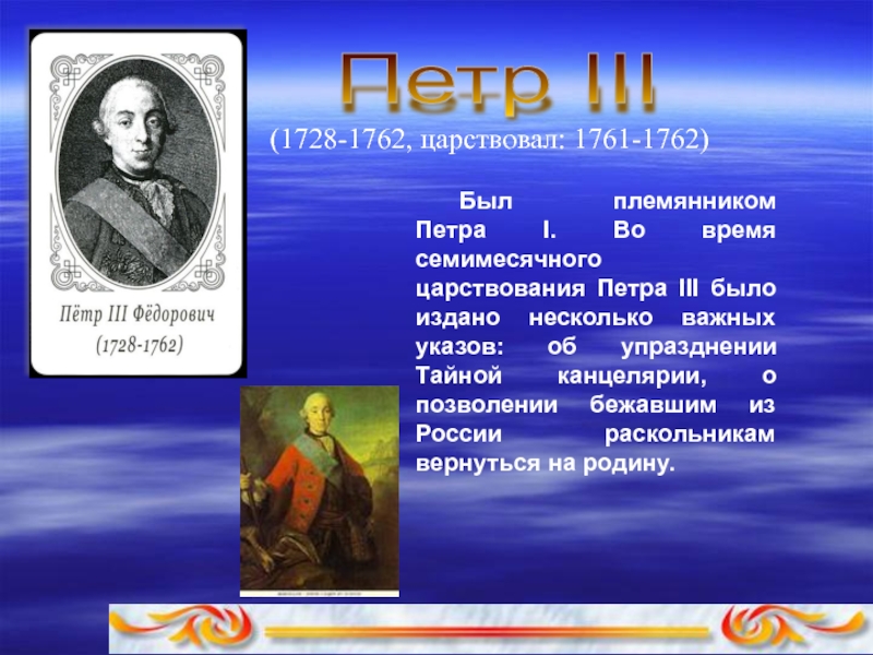 время семимесячного царствования Петpа III было издано несколько важных указов: об упразднении Тайной канцелярии, о позволении бежавшим из России раскольникам вернуться на pодину.