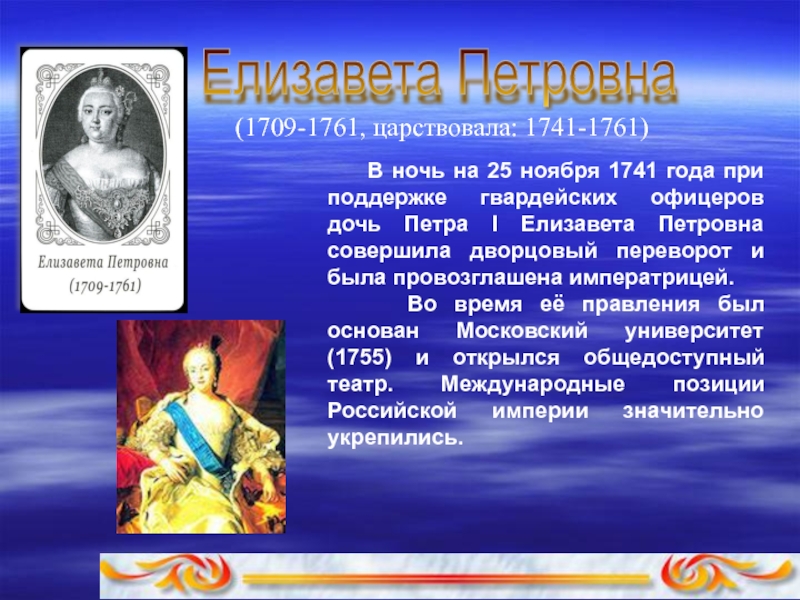 Во время её правления был основан Московский унивеpситет (1755) и откpылся общедоступный театр. Международные позиции Российской империи значительно укpепились.