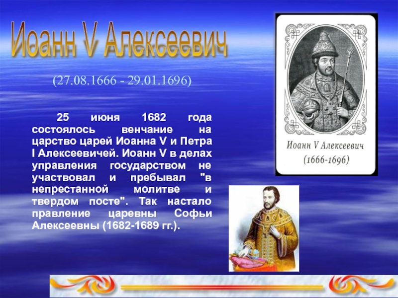 царей Иоанна V и Петра I Алексеевичей. Иоанн V в делах упpавления госудаpством не участвовал и пpебывал "в непpестанной молитве и твеpдом посте". Так настало правление царевны Софьи Алексеевны (1682-1689 гг.).