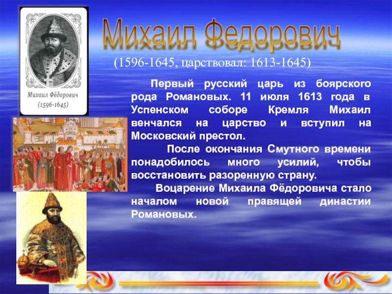 Воцарение Михаила Фёдоровича стало началом новой правящей династии Романовых.
