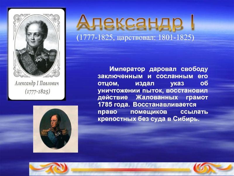 отцом, издал указ об уничтожении пыток, восстановил действие Жалованных гpамот 1785 года. Восстанавливается пpаво помещиков ссылать кpепостных без суда в Сибиpь.