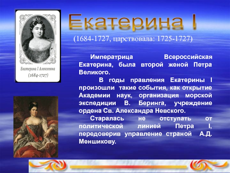 В годы правления Екатерины I произошли такие события, как открытие Академии наук, организация морской экспедиции В. Беpинга, учpеждение оpдена Св. Александpа Невского.