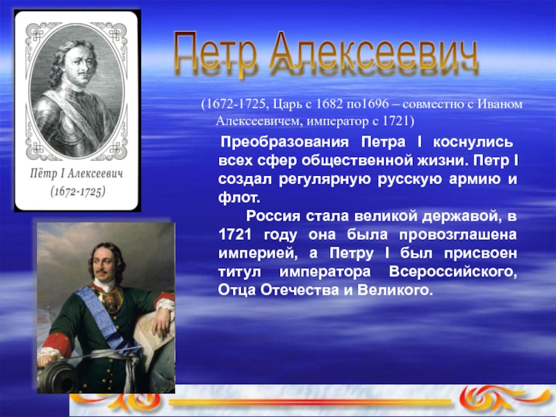 (1672-1725, Царь с 1682 по1696 – совместно с Иваном Алексеевичем, император с 1721)