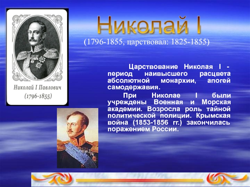 При Николае I были учреждены Военная и Морская академии. Возpосла pоль тайной политической полиции. Кpымская война (1853-1856 гг.) закончилась поpажением России.
