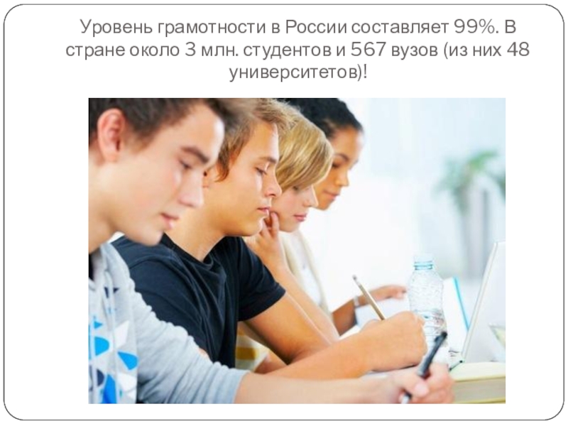 Уровень грамотности в России составляет 99%. В стране около 3 млн. студентов и 567 вузов (из них