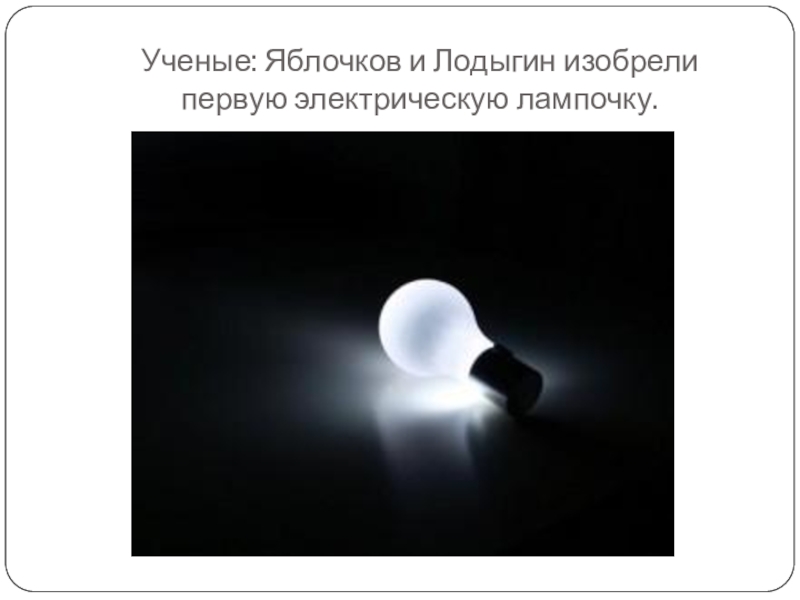 Слайд 17Ученые: Яблочков и Лодыгин изобрели первую электрическую лампочку.