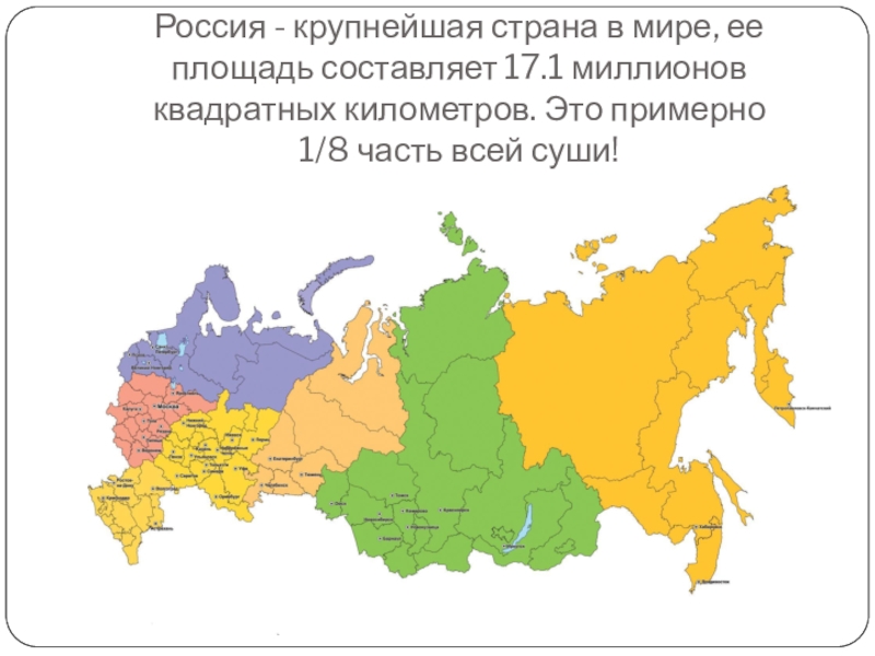 Слайд 6Россия - крупнейшая страна в мире, ее площадь составляет 17.1 миллионов