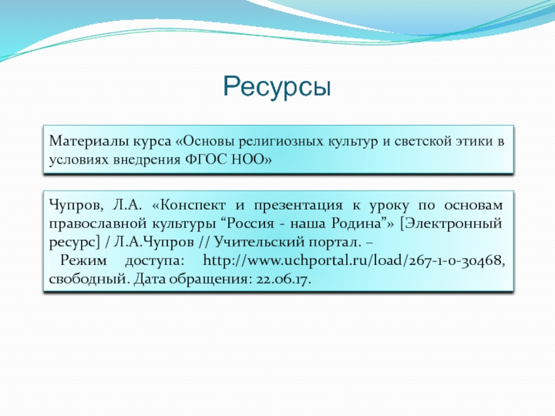 Чупров, Л.А. «Конспект и презентация к уроку по основам православной культуры “Россия - наша Родина”» [Электронный ресурс] / Л.А.Чупров // Учительский портал. –