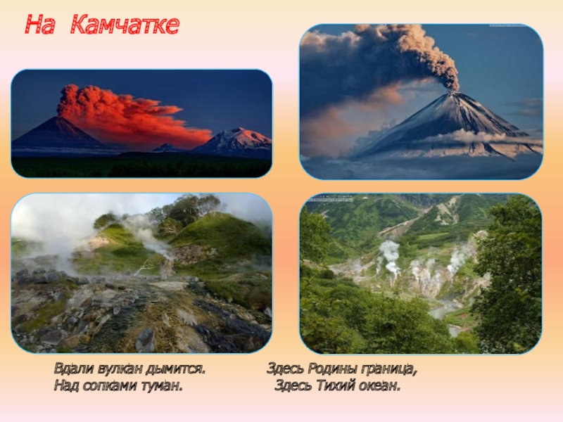 На КамчаткеВдали вулкан дымится.       Здесь Родины граница,Над сопками туман.