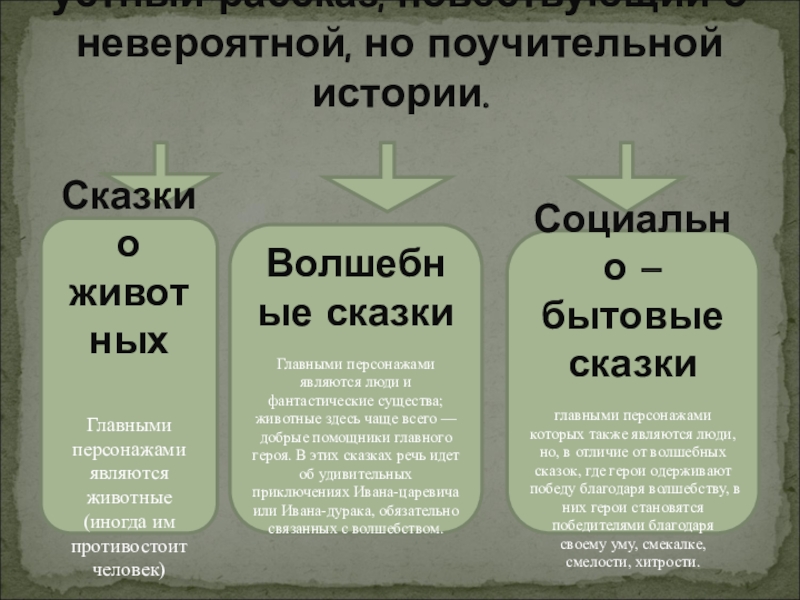 главными персонажами которых также являются люди, но, в отличие от волшебных сказок, где герои одерживают победу благодаря волшебству, в них герои становятся победителями благодаря своему уму, смекалке, смелости, хитрости.