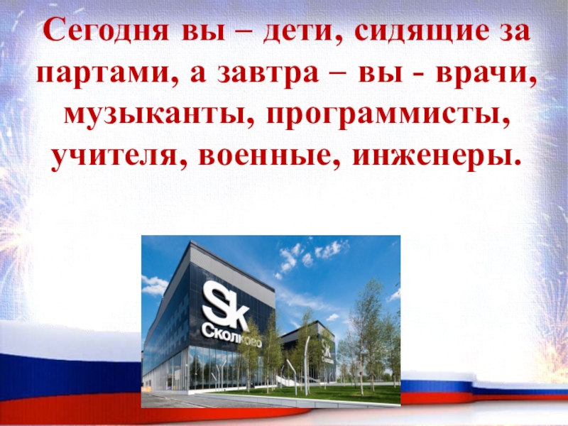Сегодня вы – дети, сидящие за партами, а завтра – вы - врачи, музыканты, программисты, учителя, военные,