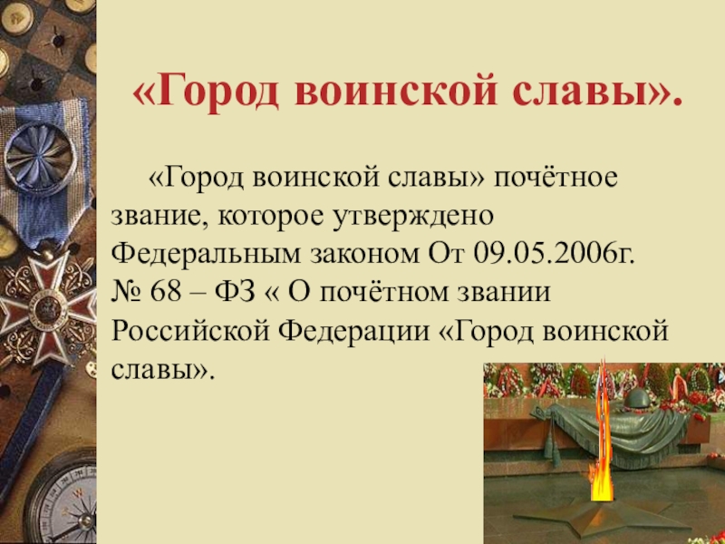 которое утверждено Федеральным законом От 09.05.2006г. № 68 – ФЗ « О почётном звании Российской Федерации «Город воинской славы».