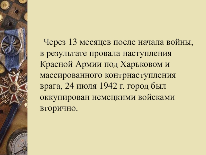 провала наступления Красной Армии под Харьковом и массированного контрнаступления врага, 24 июля 1942 г. город был оккупирован немецкими войсками вторично.