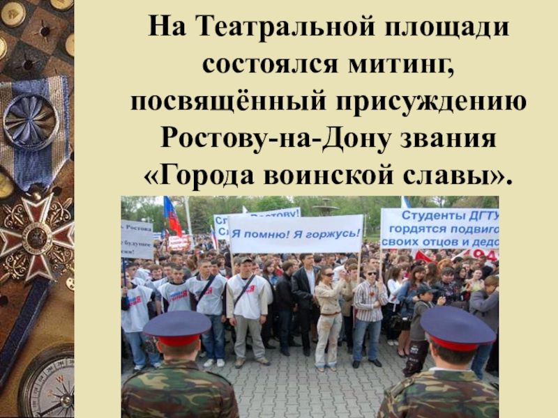 Слайд 33На Театральной площади состоялся митинг, посвящённый присуждению Ростову-на-Дону звания «Города воинской