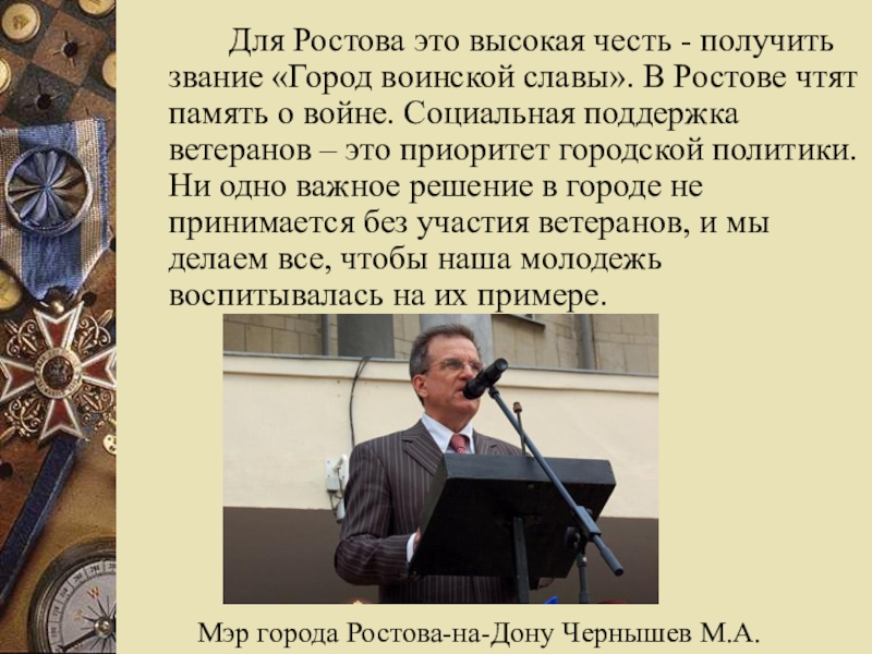 получить звание «Город воинской славы». В Ростове чтят память о войне. Социальная поддержка ветеранов – это приоритет городской политики. Ни одно важное решение в городе не принимается без участия ветеранов, и мы делаем все, чтобы наша молодежь воспитывалась на их примере.