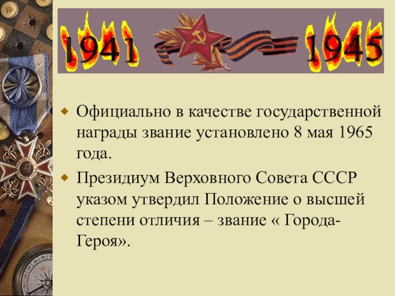 Слайд 4Официально в качестве государственной награды звание установлено 8 мая 1965 года.