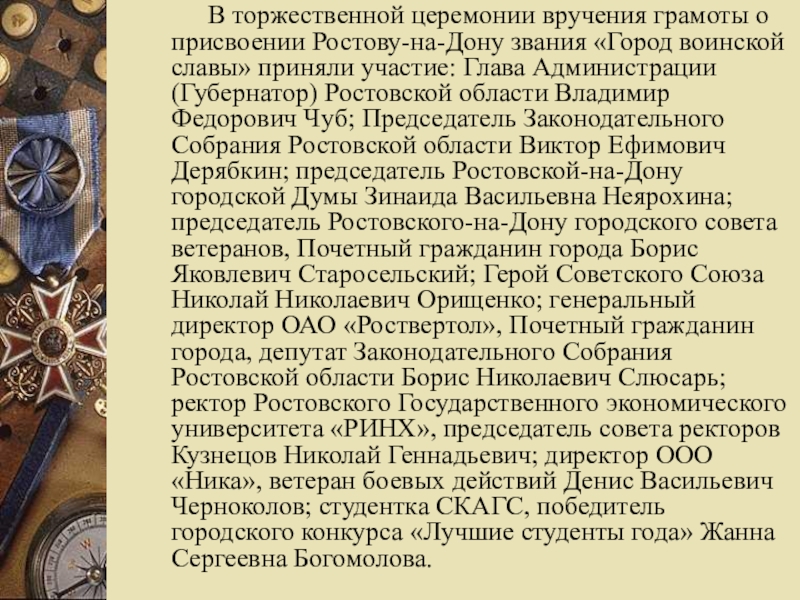 присвоении Ростову-на-Дону звания «Город воинской славы» приняли участие: Глава Администрации (Губернатор) Ростовской области Владимир Федорович Чуб; Председатель Законодательного Собрания Ростовской области Виктор Ефимович Дерябкин; председатель Ростовской-на-Дону городской Думы Зинаида Васильевна Неярохина; председатель Ростовского-на-Дону городского совета ветеранов, Почетный гражданин города Борис Яковлевич Старосельский; Герой Советского Союза Николай Николаевич Орищенко; генеральный директор ОАО «Роствертол», Почетный гражданин города, депутат Законодательного Собрания Ростовской области Борис Николаевич Слюсарь; ректор Ростовского Государственного экономического университета «РИНХ», председатель совета ректоров Кузнецов Николай Геннадьевич; директор ООО «Ника», ветеран боевых действий Денис Васильевич Черноколов; студентка СКАГС, победитель городского конкурса «Лучшие студенты года» Жанна Сергеевна Богомолова.