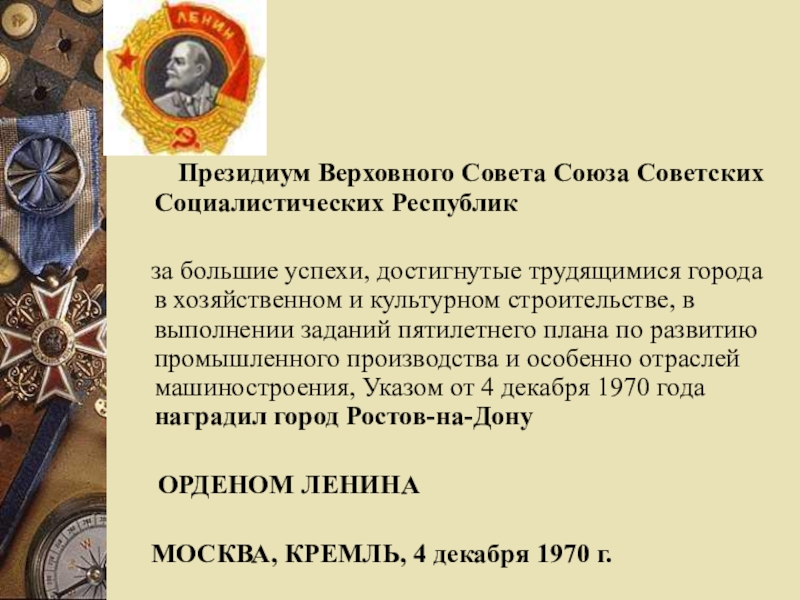 за большие успехи, достигнутые трудящимися города в хозяйственном и культурном строительстве, в выполнении заданий пятилетнего плана по развитию промышленного производства и особенно отраслей машиностроения, Указом от 4 декабря 1970 года наградил город Ростов-на-Дону