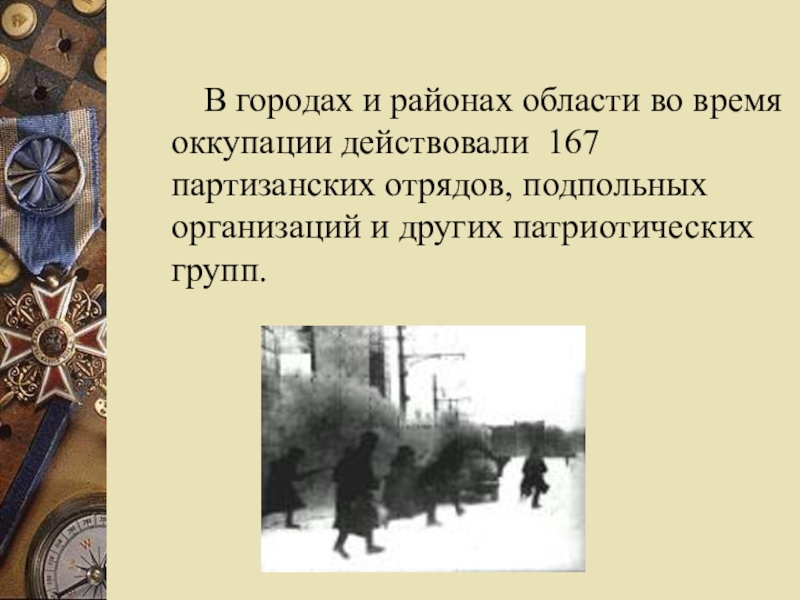 оккупации действовали 167 партизанских отрядов, подпольных организаций и других патриотических групп.