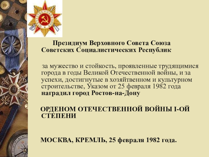 за мужество и стойкость, проявленные трудящимися города в годы Великой Отечественной войны, и за успехи, достигнутые в хозяйтвенном и культурном строительстве, Указом от 25 февраля 1982 года наградил город Ростов-на-Дону