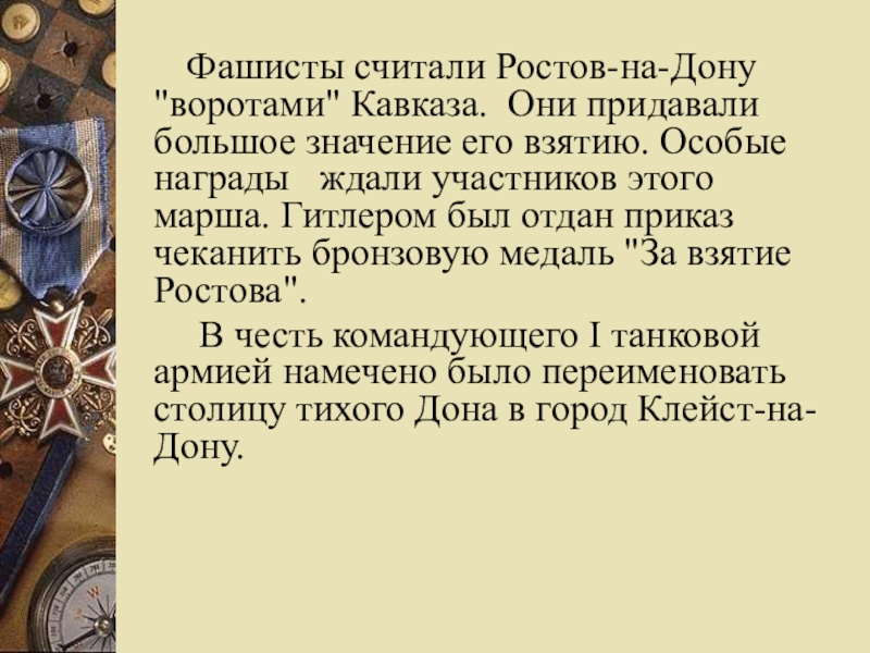 придавали большое значение его взятию. Особые награды ждали участников этого марша. Гитлером был отдан приказ чеканить бронзовую медаль "За взятие Ростова".