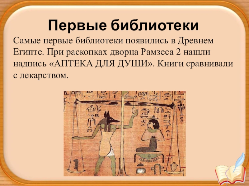Самые первые библиотеки появились в Древнем Египте. При раскопках дворца