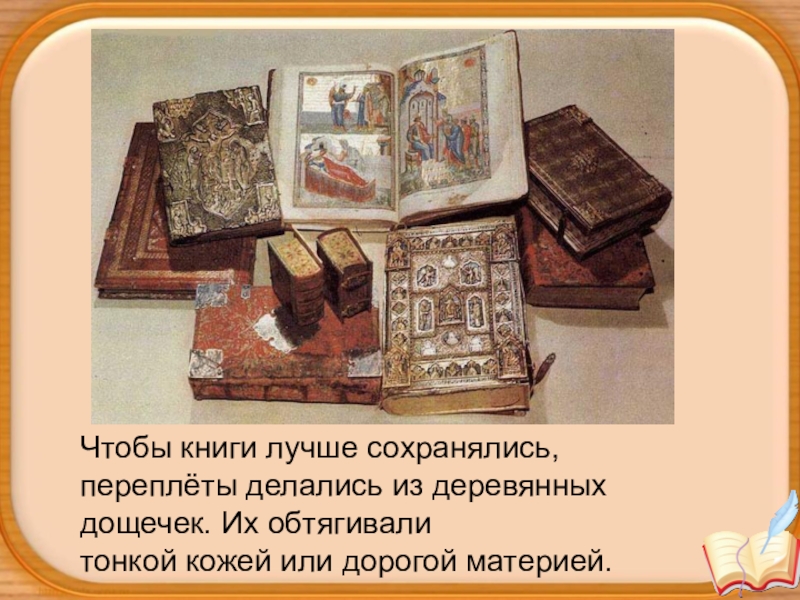 Слайд 20Чтобы книги лучше сохранялись, переплёты делались из деревянных дощечек. Их обтягивали