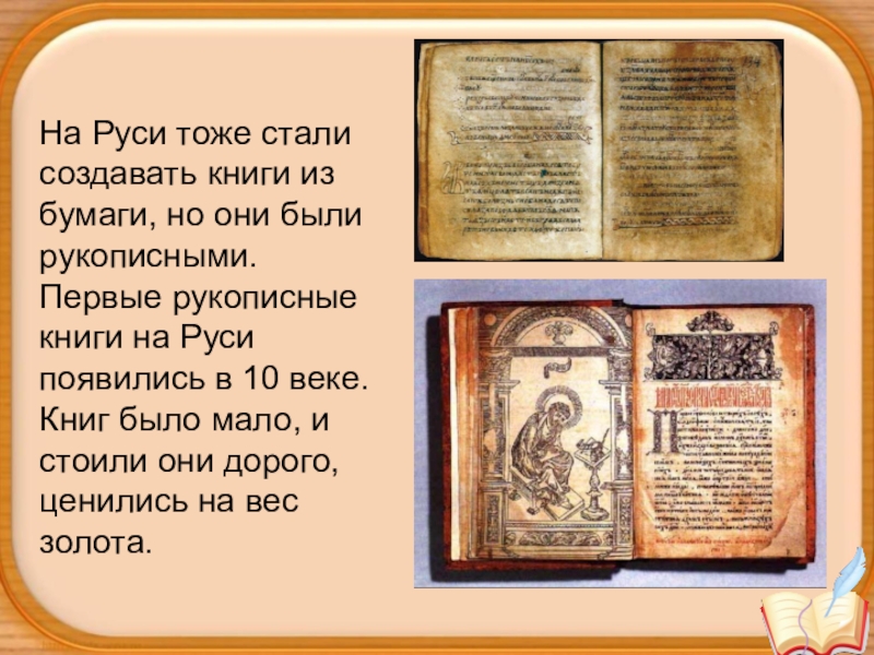 Слайд 19На Руси тоже стали создавать книги из бумаги, но они были