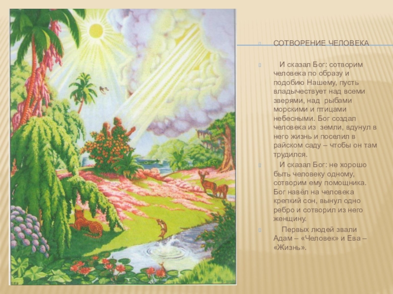 подобию Нашему, пусть владычествует над всеми зверями, над рыбами морскими и птицами небесными. Бог создал человека из земли, вдунул в него жизнь и поселил в райском саду – чтобы он там трудился.