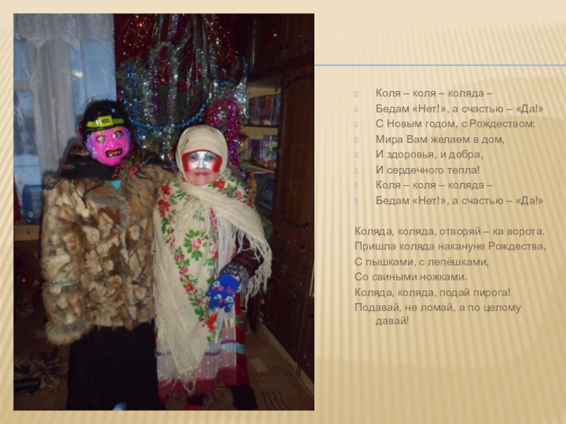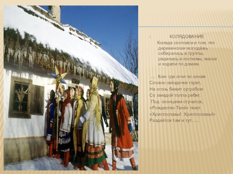 том, что деревенская молодёжь собиралась в группы, рядились в костюмы, маски и ходили по домам.