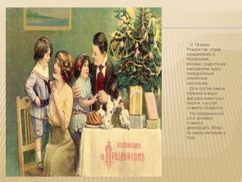Слайд 10 С 18 века Рождество стали праздновать с подарками, елками,
