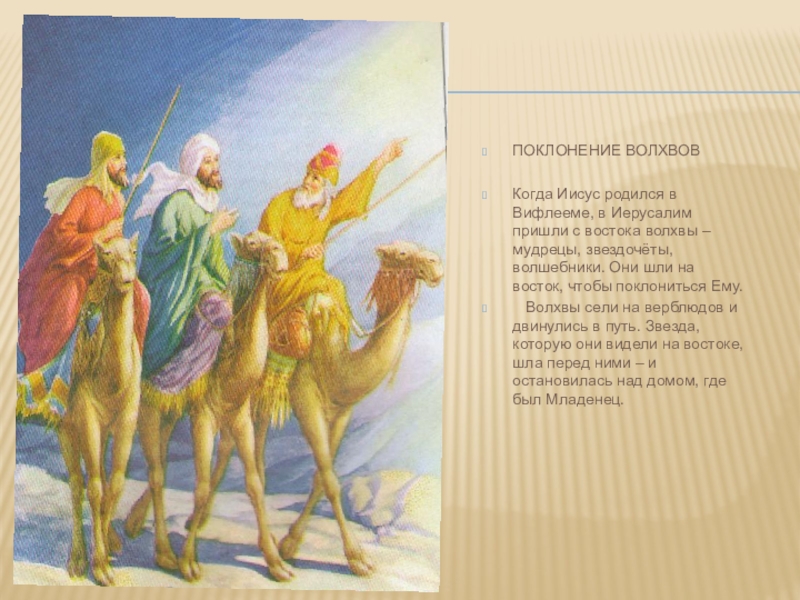 волхвы – мудрецы, звездочёты, волшебники. Они шли на восток, чтобы поклониться Ему.