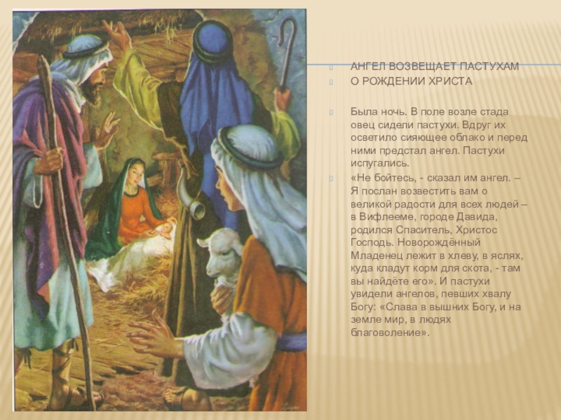 «Не бойтесь, - сказал им ангел. – Я послан возвестить вам о великой радости для всех людей – в Вифлееме, городе Давида, родился Спаситель, Христос Господь. Новорождённый Младенец лежит в хлеву, в яслях, куда кладут корм для скота, - там вы найдёте его». И пастухи увидели ангелов, певших хвалу Богу: «Слава в вышних Богу, и на земле мир, в людях благоволение».