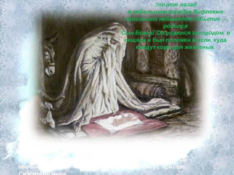 Сын Божий .Он родился за городом, в пещере и был положен в ясли, куда кладут корм для животных.