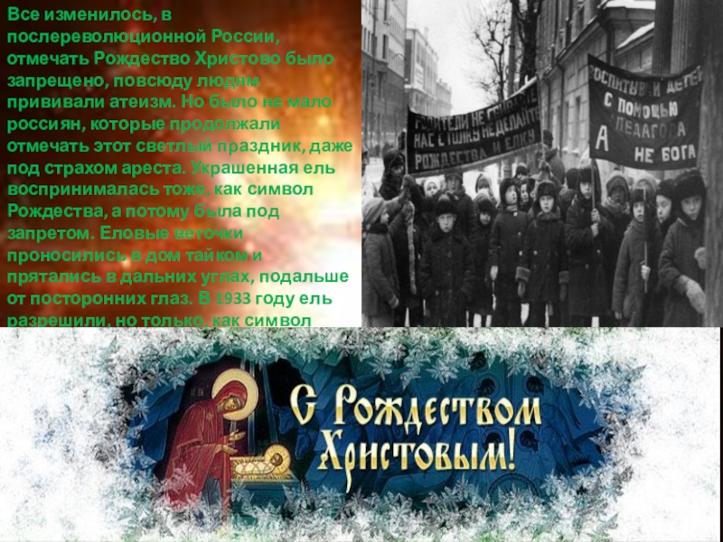 Слайд 17Все изменилось, в послереволюционной России, отмечать Рождество Христово было запрещено, повсюду