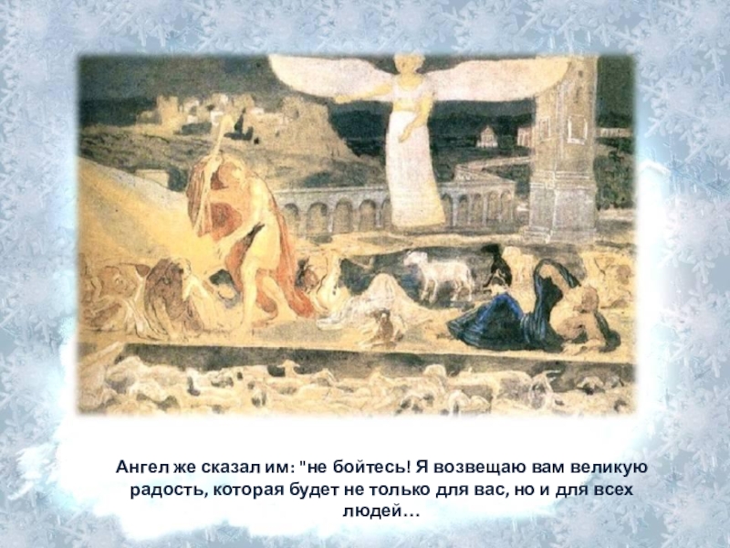 Слайд 7Ангел же сказал им: "не бойтесь! Я возвещаю вам великую радость,