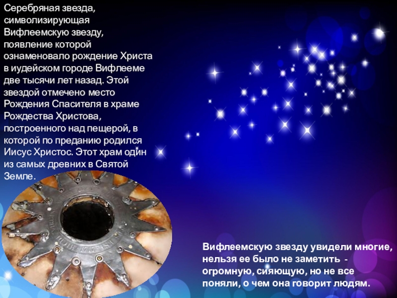 Серебряная звезда, символизирующая Вифлеемскую звезду, появление которой ознаменовало рождение Христа в иудейском городе Вифлееме две тысячи лет назад. Этой звездой отмечено место Рождения Спасителя в храме Рождества Христова, построенного над пещерой, в которой по преданию родился Иисус Христос. Этот храм один из самых древних в Святой Земле.