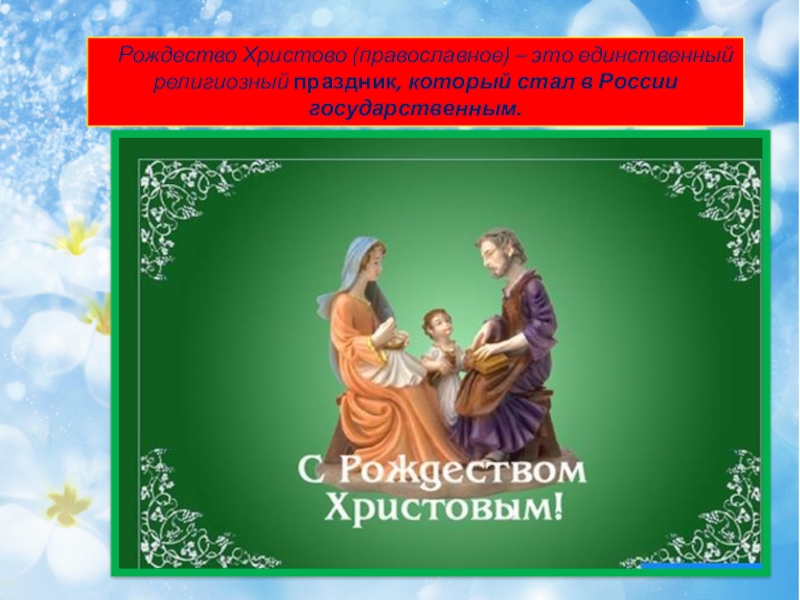Слайд 2 Рождество Христово (православное) – это единственный религиозный праздник, который