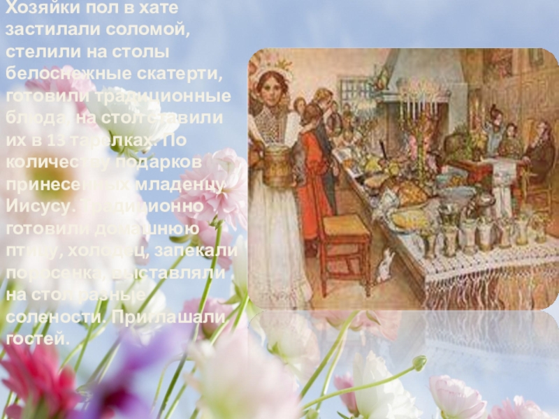 Слайд 16Хозяйки пол в хате застилали соломой, стелили на столы белоснежные скатерти,