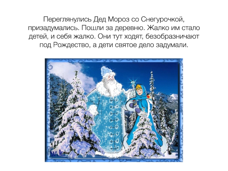 Слайд 13Переглянулись Дед Мороз со Снегурочкой, призадумались. Пошли за деревню. Жалко им