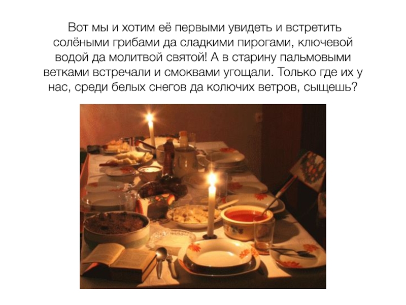 грибами да сладкими пирогами, ключевой водой да молитвой святой! А в старину пальмовыми ветками встречали и смоквами угощали. Только где их у нас, среди белых снегов да колючих ветров, сыщешь?