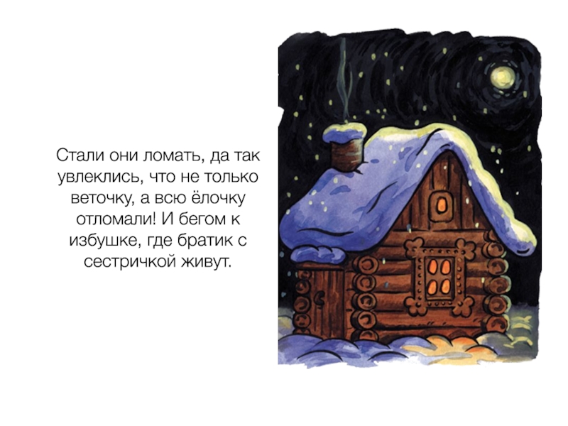 всю ёлочку отломали! И бегом к избушке, где братик с сестричкой живут.