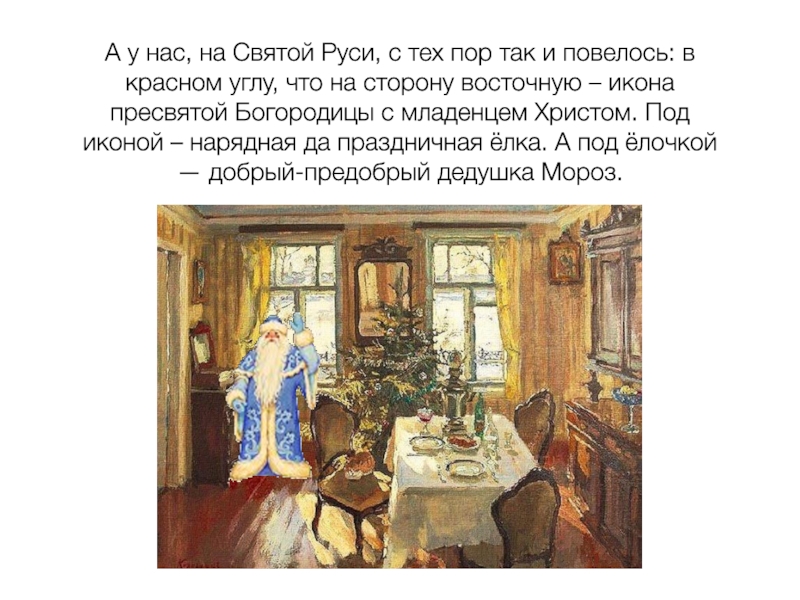повелось: в красном углу, что на сторону восточную – икона пресвятой Богородицы с младенцем Христом. Под иконой – нарядная да праздничная ёлка. А под ёлочкой — добрый-предобрый дедушка Мороз.