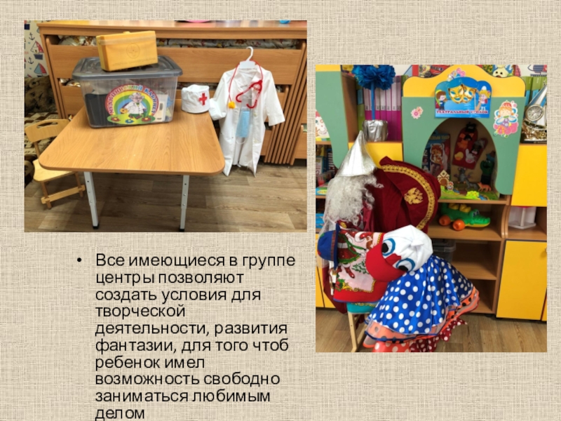 Слайд 4Все имеющиеся в группе центры позволяют создать условия для творческой деятельности,