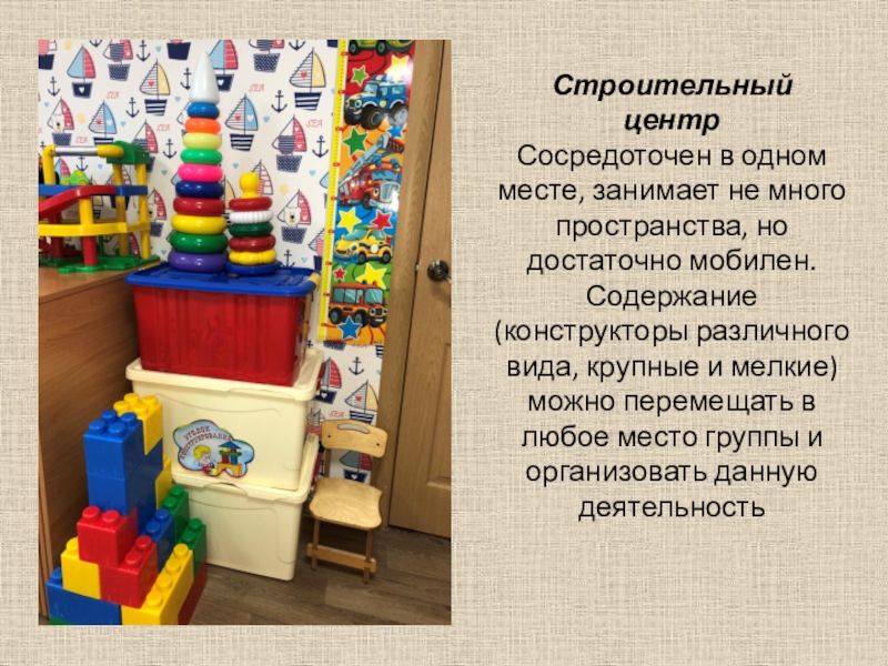 мобилен. Содержание (конструкторы различного вида, крупные и мелкие) можно перемещать в любое место группы и организовать данную деятельность