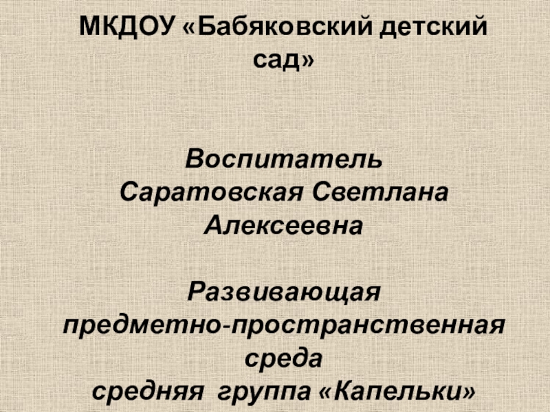 Слайд 1МКДОУ «Бабяковский детский сад» Воспитатель Саратовская Светлана Алексеевна Развивающая предметно-пространственная среда средняя группа «Капельки»