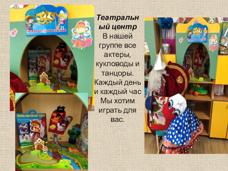 Слайд 16Театральный центр В нашей группе все актеры, кукловоды и танцоры. Каждый день и