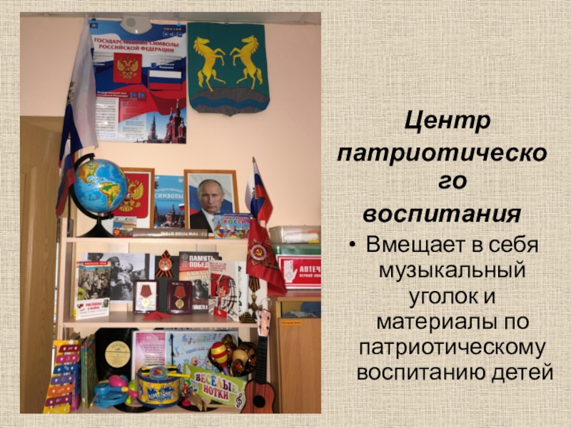 Центр патриотического воспитанияВмещает в себя музыкальный уголок и материалы по патриотическому воспитанию детей