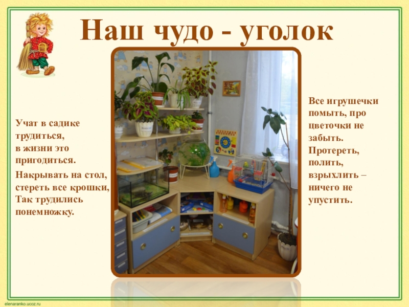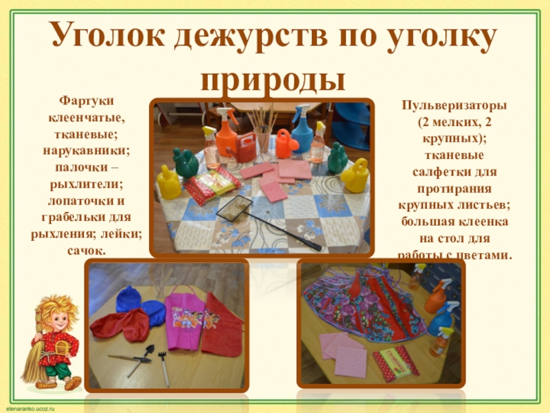 Поощрять желание выполнять различные поручения, связанные с уходом за животными и растениями в уголке природы; обязанности дежурного в уголке природы (поливать комнатные растения, рыхлить почву и т. д.).