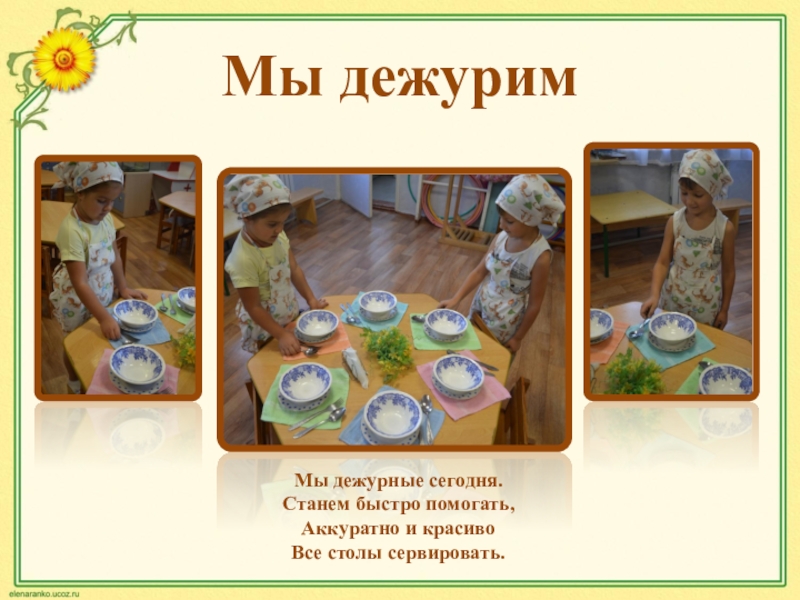 Приучать добросовестно выполнять обязанности дежурных по столовой: сервировать стол, приводить его в порядок после еды